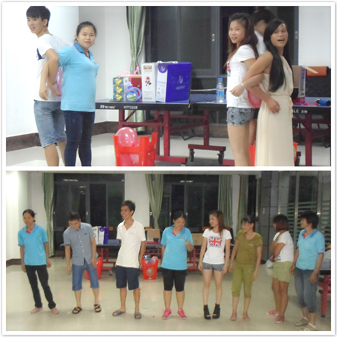 在行政工會的精心準備下,把會議布置得溫馨而浪漫;首先由工會主席致祝福詞拉開了活動的序幕; 按照活動的流程,接著進行“背對背擠氣球”的游戲,現場氣球爆聲如鞭炮,讓大家都熱情歡呼、情緒高昂;使整個活動的變得刺激又興奮,同時通過轉瓶子的方式抽選出十人上臺進行“三人抱成團”的游戲,逗得臺下的壽星們都笑不攏嘴,熱情高漲。